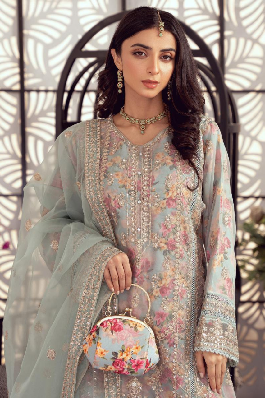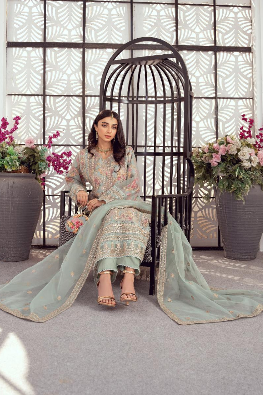 Haya Luxe gives a fresh and graceful look. The organza shirt and dupatta have light details that make it shine, while the Luxury Malai Pants keep it easy to wear and comfortable. Perfect for any celebration or evening event.