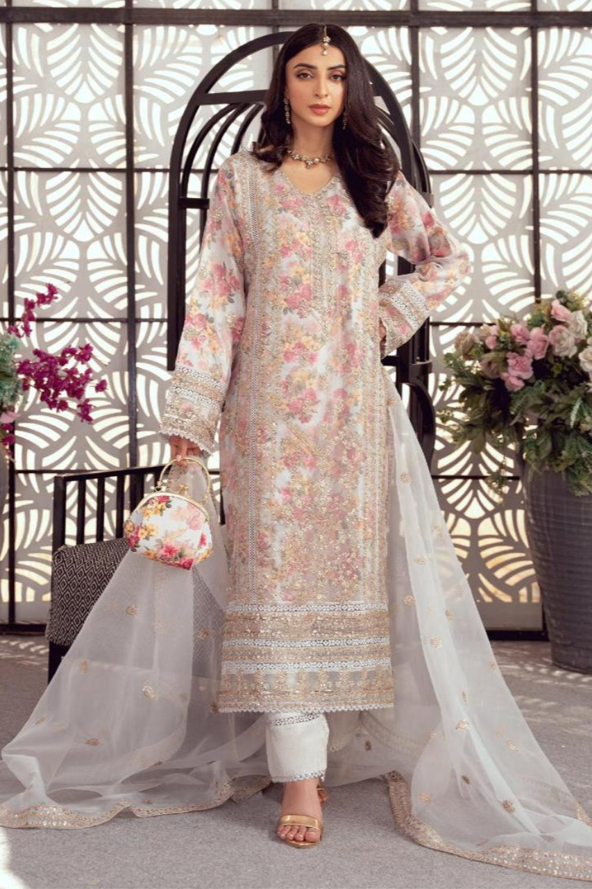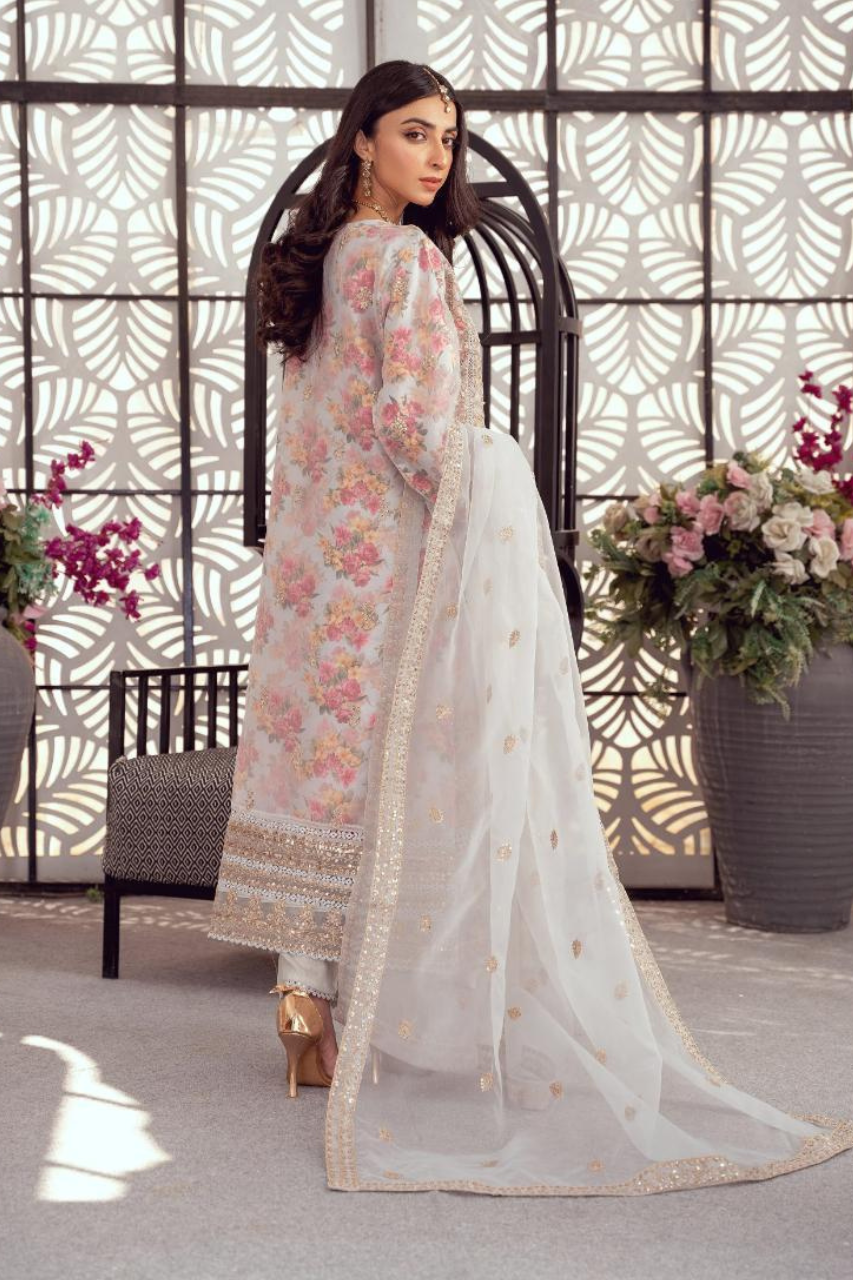 Nooré Nazaakat is all about soft and classy style. The organza shirt and dupatta have a delicate design, and the Luxury Malai Pants add comfort and grace. A perfect choice for any festive or semi-formal gathering.
